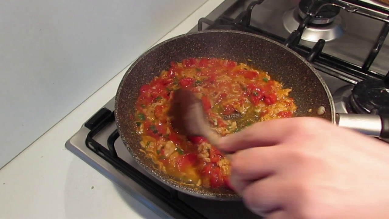 Put olive oil in the pan add some garlic cook a little then add the tuna. Cook the tuna, add the salt wine chilli if you like. Then add the cherry tomatoes when the sauce has dried and you can remove it from the heat. If you see that the sauce stays dry you can add cooking water