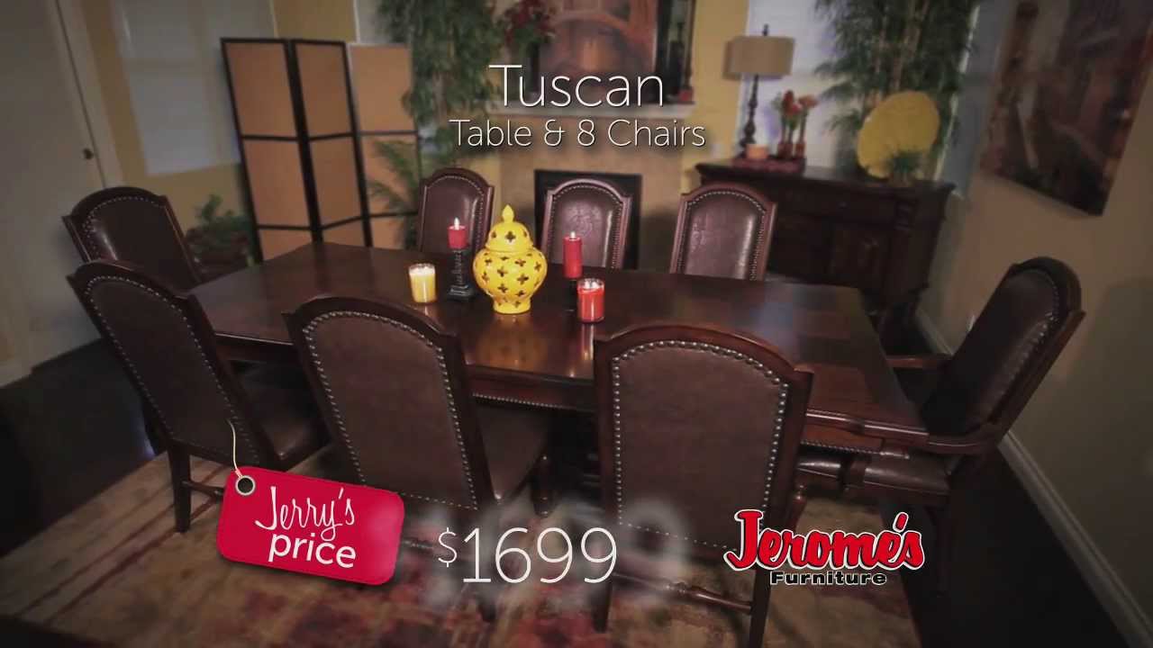 – Reminiscent of old Italian design the Tuscan features beautiful carved wood detailing and Mediterranean architectural forms in the crowning arch on the hutch. The rectangular table features mosaic-styled rope cherry veneer work and extends to a generous 108″ with two leaves making it great for entertaining. The glass table features a 60″ round glass top and pedestal base. Coordinating bonded leather clad chairs add spice to the collection. Felt-lined drawers in the buffet and server ensure safe keeping of your dinnerware.