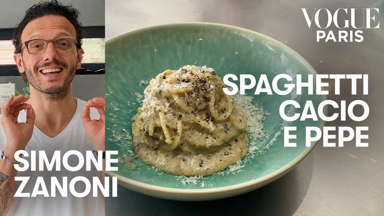 Michelin starred chef behind the Le George restaurant at the Four Seasons Hotel Geroge V in Paris, Simone Zanoni cooks his recipe for the very best cacio e pepe spaghetti, exclusively for Vogue Paris. Follow this Italian classic at home, step by step.