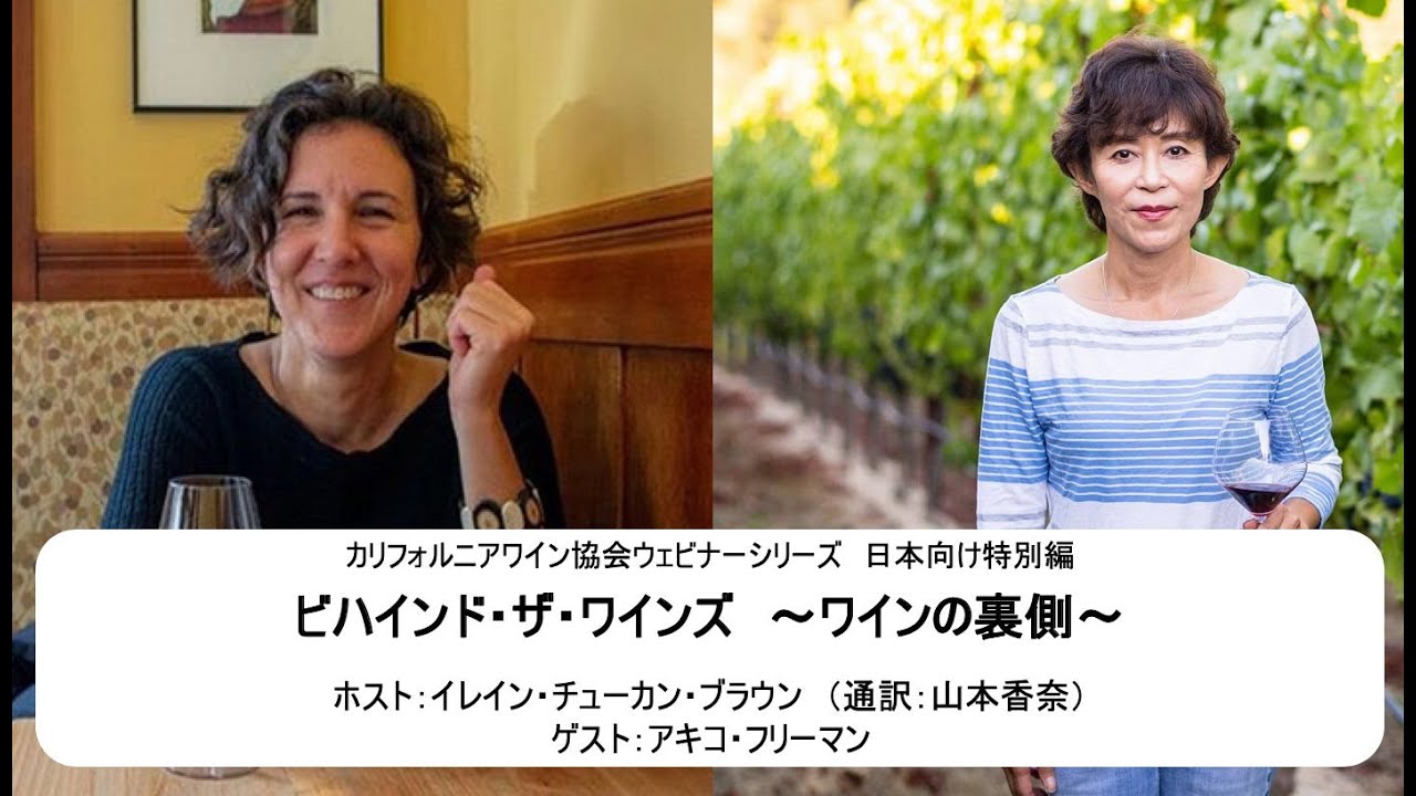 イレイン・チューカン・ブラウンをホストに、カリフォルニアを代表するワインメーカーたちを迎えたウェビナーシリーズ「Behind The Wines」。今回は、カリフォルニアでワイナリーと畑を所有する唯一の日本人オーナー女性醸造家であるアキコ・フリーマンさん(フリーマン・ヴィンヤード&ワイナリー)をゲストに迎えた、日本向け特別編です。(通訳:山本香奈)