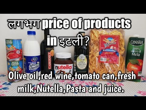 What is the price of tomato can, fettuccine pasta, olive oil extra vergine, red wine, Nutella cream, fruit juice and fresh milk in Italy. beveragecuisineExtrafettuccineFooditalianitalian cuisineitalian foodItalyItaly CuisineItaly FoodOilOlivePastapriceProductstomatovideoVlogYouTube
