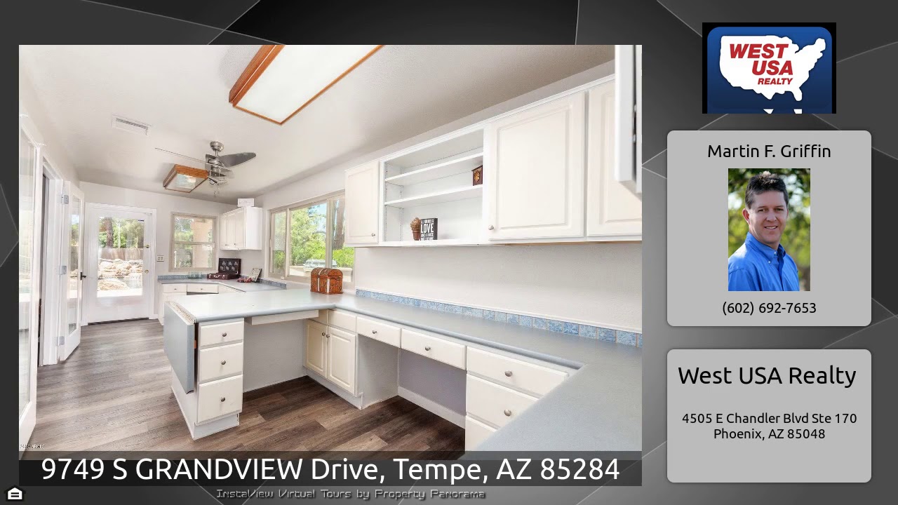 The Virtual Tour for the property at 9749 S GRANDVIEW Drive, Tempe, AZ 85284 listed for $475,000: Other homes for sale by Martin F. Griffin of West USA Realty: This home is gorgeous inside & out! Starting with beautiful curb appeal that has wonderful mature shade trees and RV gates for this cul-de-sac lot. Enter to beautiful wood floors throughout the home. The spacious open floor plan for the kitchen, dining and family rooms are perfect for gathering with friends & family! The family room has a cozy brick fireplace. The eat-in kitchen has an abundance of oak cabinets, beautiful backsplash, …