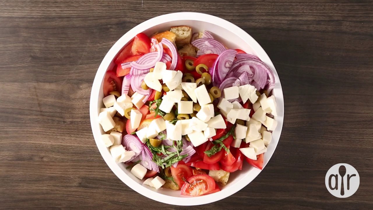 Fresh mozzarella, vinaigrette, olives or capers, make an excellent Greek Salad. Homemade croutons and basil add a taste of comfort while the red onions give a nice crunch and spiciness. Serve with your favorite pasta dish or take with you to a potluck! Get the recipe for Panzanella Salad: