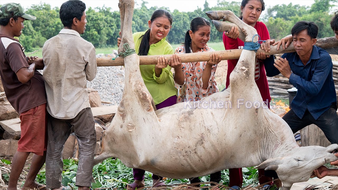 Hello all friends! Today I cook the ox for eating and sharing the food with my friends and my villager. The style of curry soup in my village is a very delicious and very good taste. Before cook the curry I need to BBQ the ox with a little bit of fire to burn the ox. I grilled it around 2 hours and in the morning I need to cut it to make a curry soup for eating with instant noodles and bread. After the soup is cooked I eat with my villager and sharing the soup with many of my villagers.