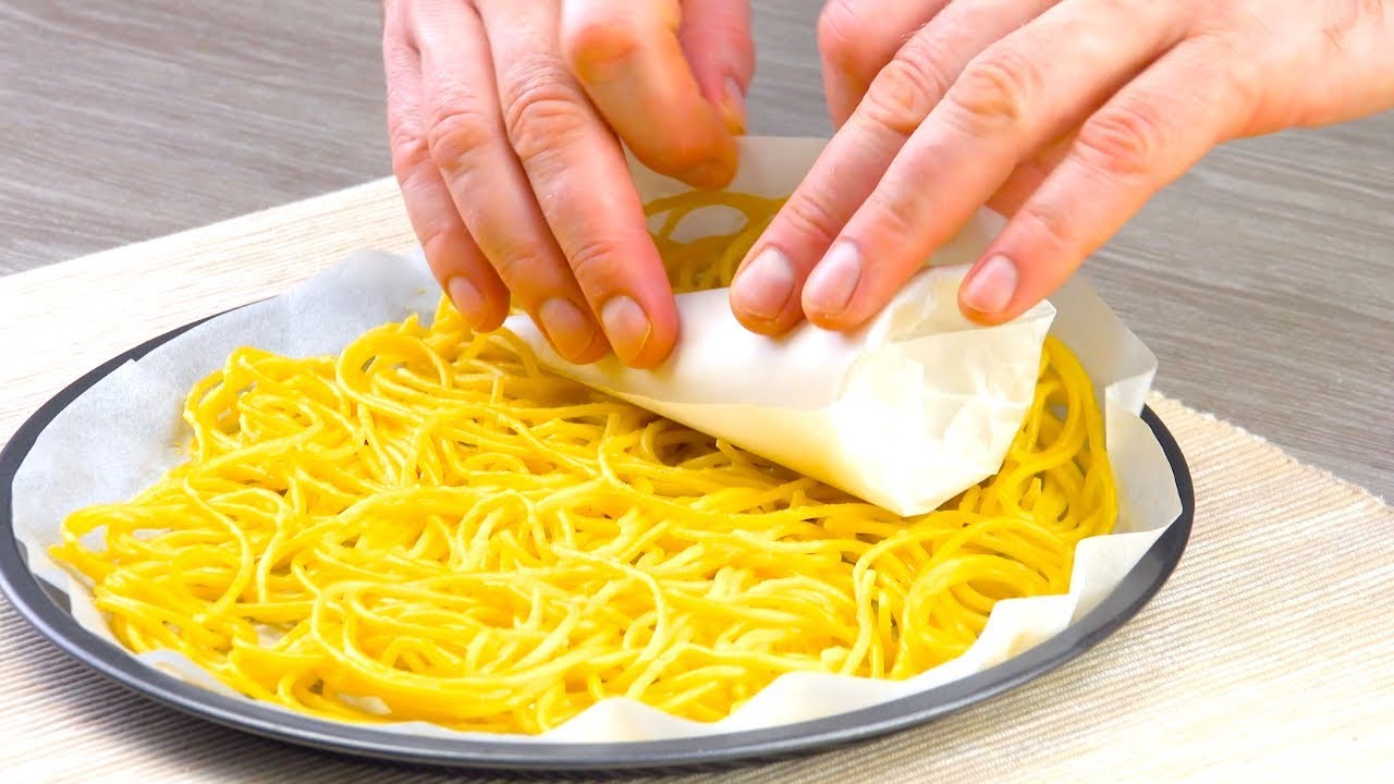 1.2 Line a round 6-inch pan with parchment paper, spread the noodles over it, and cook for 10 minutes. Let the spaghetti cool down afterwards.