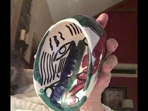 Signed Art. Rumi, Milano. Made in Italy (205). Bowl itself is heavy. The glaze is thick and Has four different colors hey wine red, black, Dark Caribbean blue, and pale green. The design appears as a Picasso drawing in the middle of the bottom of the bowl. If anybody knows what this is please comment below. Thank you