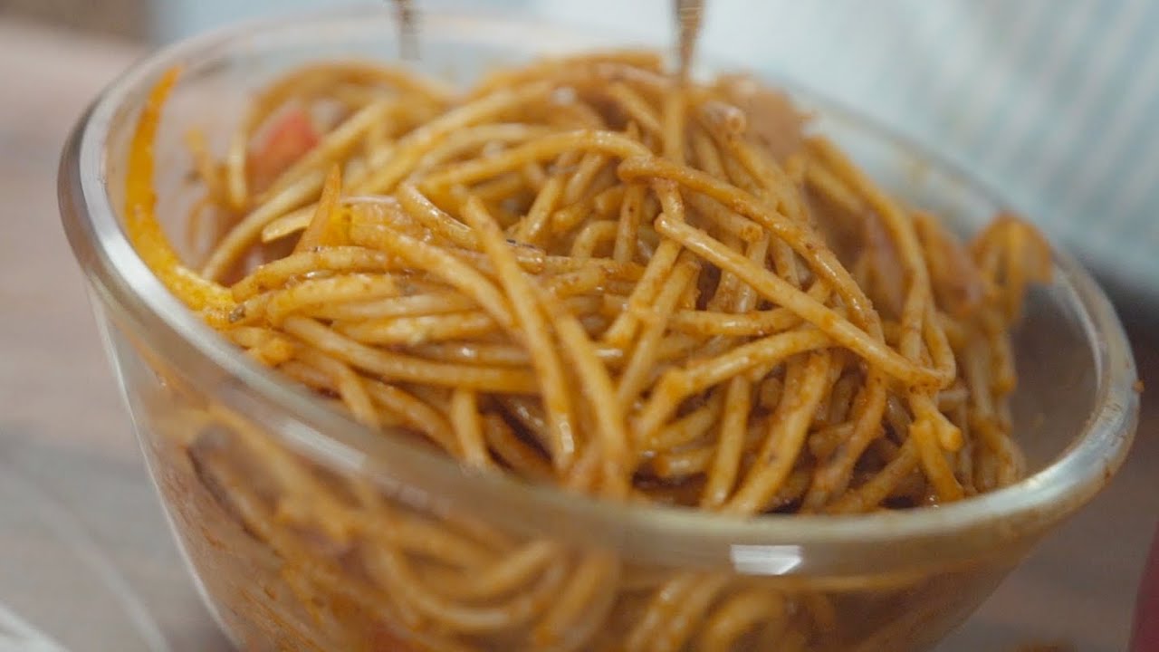 Spaghetti is a long, thin, solid, cylindrical pasta. It is a staple food of traditional Italian cuisine. Usually made of milled wheat and water and sometimes enriched with vitamins and minerals. An emblem of Italian cuisine, spaghetti is frequently served with tomato sauce, which may contain various herbs (especially oregano and basil), olive oil, meat, or vegetables.