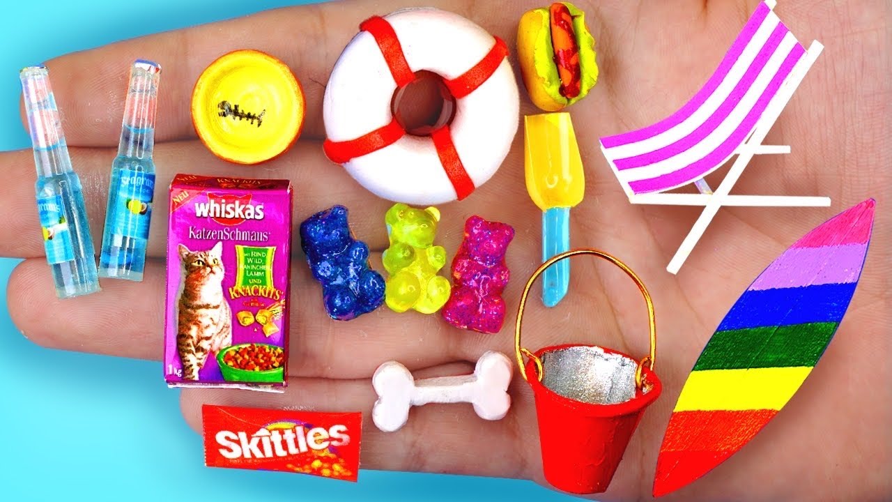 How to make realistic miniature crafts and simple diy and just mini food ? I will show you mini realistic hacks and crafts from simple materials. I will make 20 miniature diy Ideas, namely: mini seagram’s ,mini beach chairs, mini surf board, mini shove, mini shovel, mini hotdogs, mini skittles, mini candy machines, mini gummy bears, mini pet bowl, mini bone dogs, mini whiskas, mini cat tree.and more diy food.