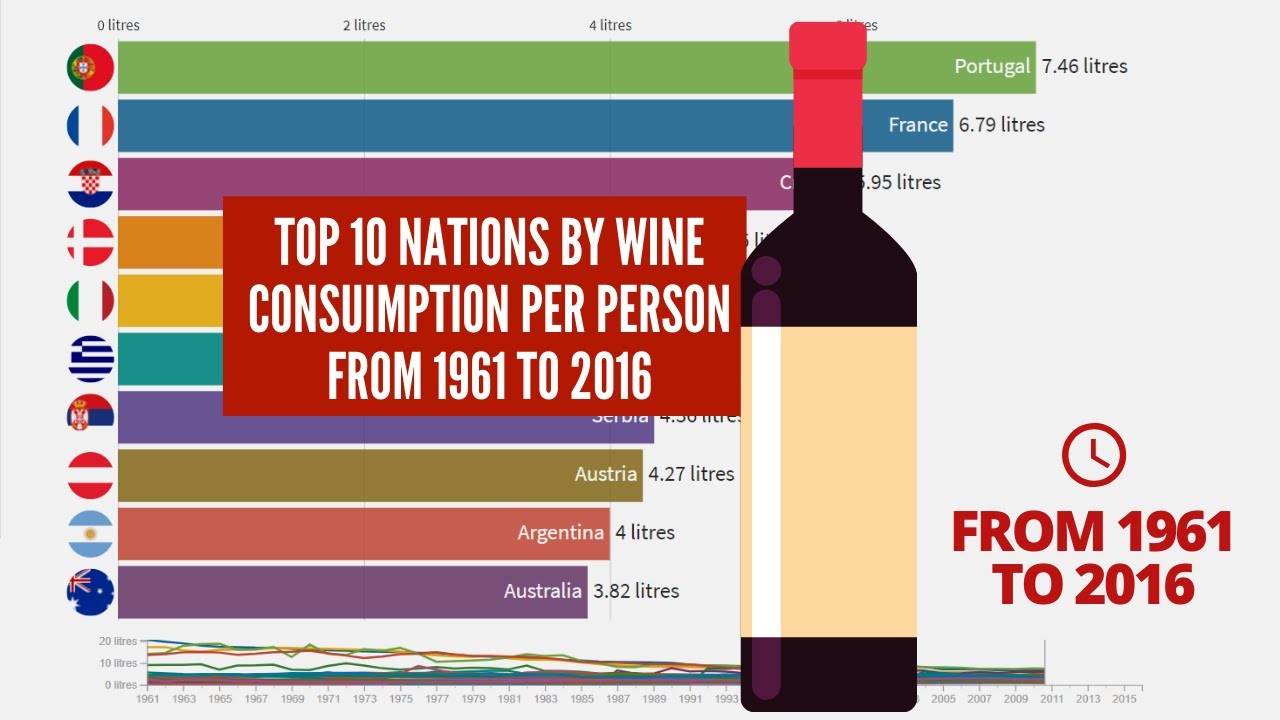 The 10 nations in the world where most wine is drunk, what are they? In this video-timeline the comparison between the 10 countries in the world where the most wine is drunk in litres.