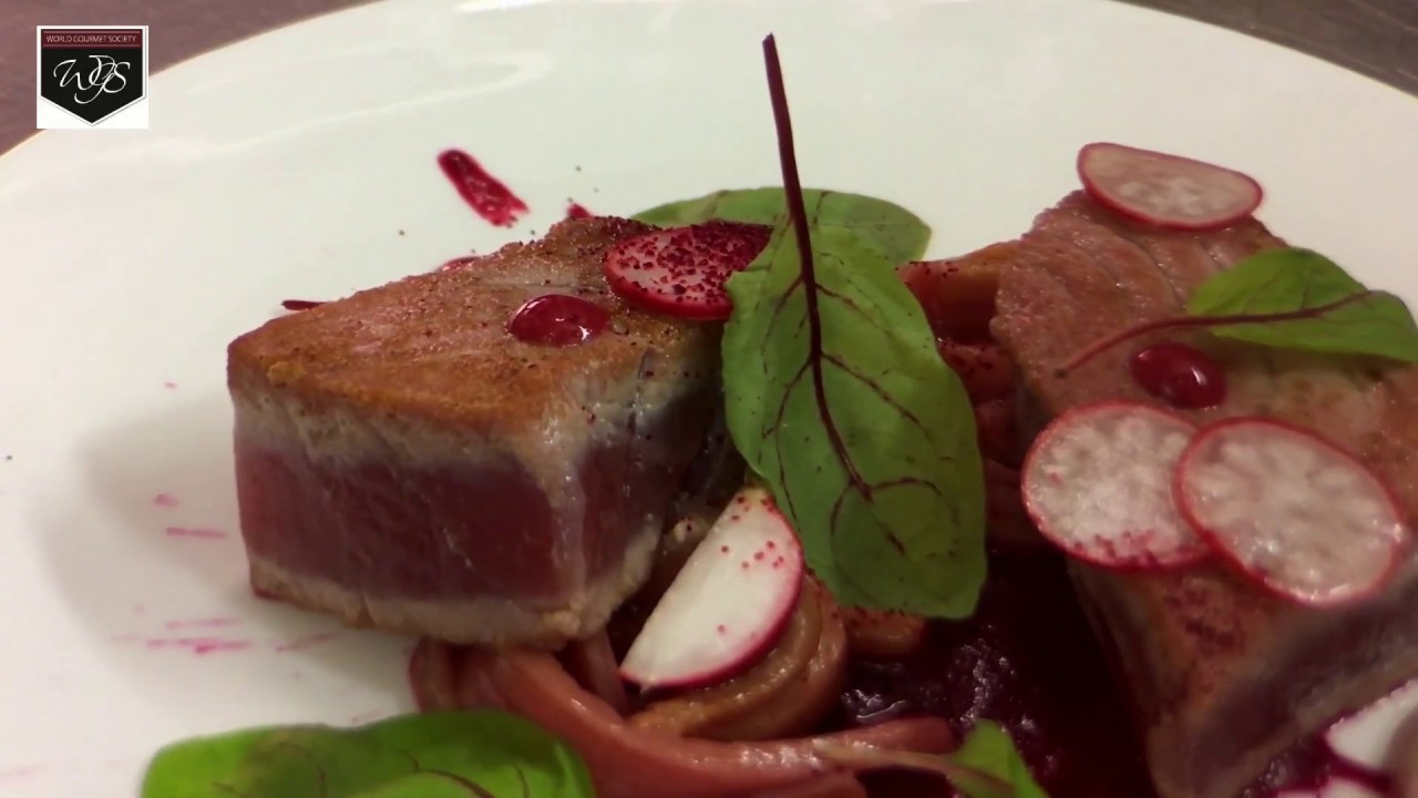 Chef Federico Bassi, representing Emilia-Romagna gastronomy by presenting his plate ‘𝑷𝒖𝒓𝒑𝒍𝒆 𝑻𝒖𝒏𝒂’, during the 2017 edition of the World Gourmet Society video challenge.