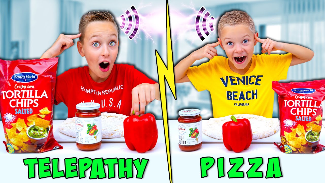 Twin telepathy pizza challenge with Roman and Max. Each round, one of them picks a pizza ingredient, while the other has to use his telepathic skills to guess which ingredient was picked. If he’s correct, he gets a point, and if not, the picker gets a point. Let’s see who makes the best yummy pizza.