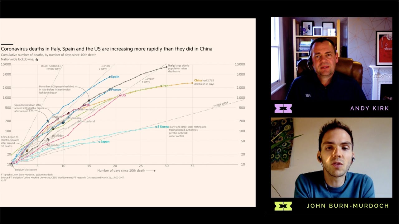 Welcome to Episode 3 of Season 1 of Explore Explain, a video and podcast series all about data visualisation design. In this third episode I am delighted to welcome John Burn-Murdoch to share the design story behind his visualisations for the ‘Coronavirus Tracker’, which has been evolving on the Financial Times’ website since February 2020. This episode was recorded on 27th March.