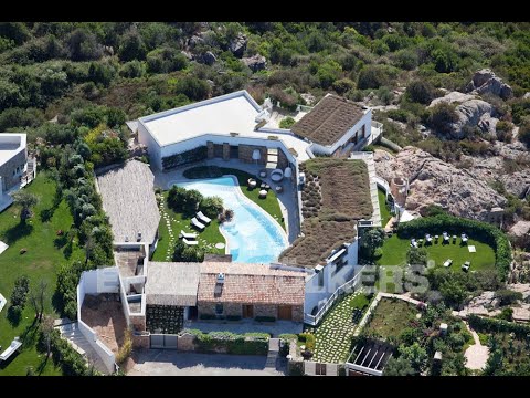 Villa Sa Contissa, with a semicircular shape, is built around a large swimming pool, characterized by a dolphin outline, next to a large barbecue area. The wide windows, both towards the sea and the pool revealing the beauty of its interior. Every detail is left to chance, a product of rare architectural elegance and balance. The great quality and high-level facilities make the villa completely autonomous and absolutely comfortable. Spread over an area of 1000 m², on two floors, the property is composed by an entrance hall, fully equipped kitchen, storeroom, dining room, living room, one master bedroom, and six bedrooms plus further two in the house expansion, seven dressing rooms, ten bathrooms, home theater, gym, and small SPA. Stone, marble, plaster, wood mixed with metal, glass, Plexiglas, and resins are the materials of this lovely villa.