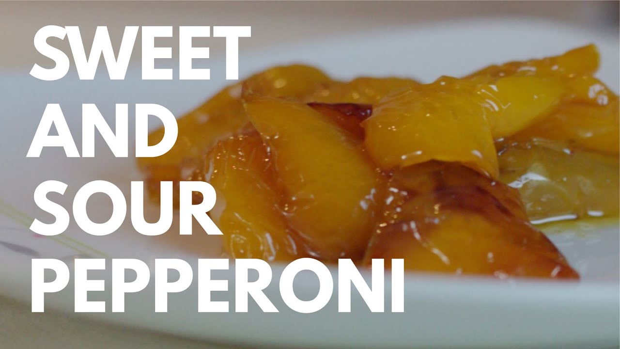 Start by cleaning up the interior of the pepperoni like you see in the video and slice them up in quite big squares.