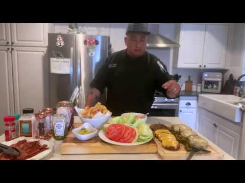 Chef Bryan Lareau with Eurest Dining Services/ Compass Group, making a burger bar with hatch green chilies, bacon, pepper jack and more!