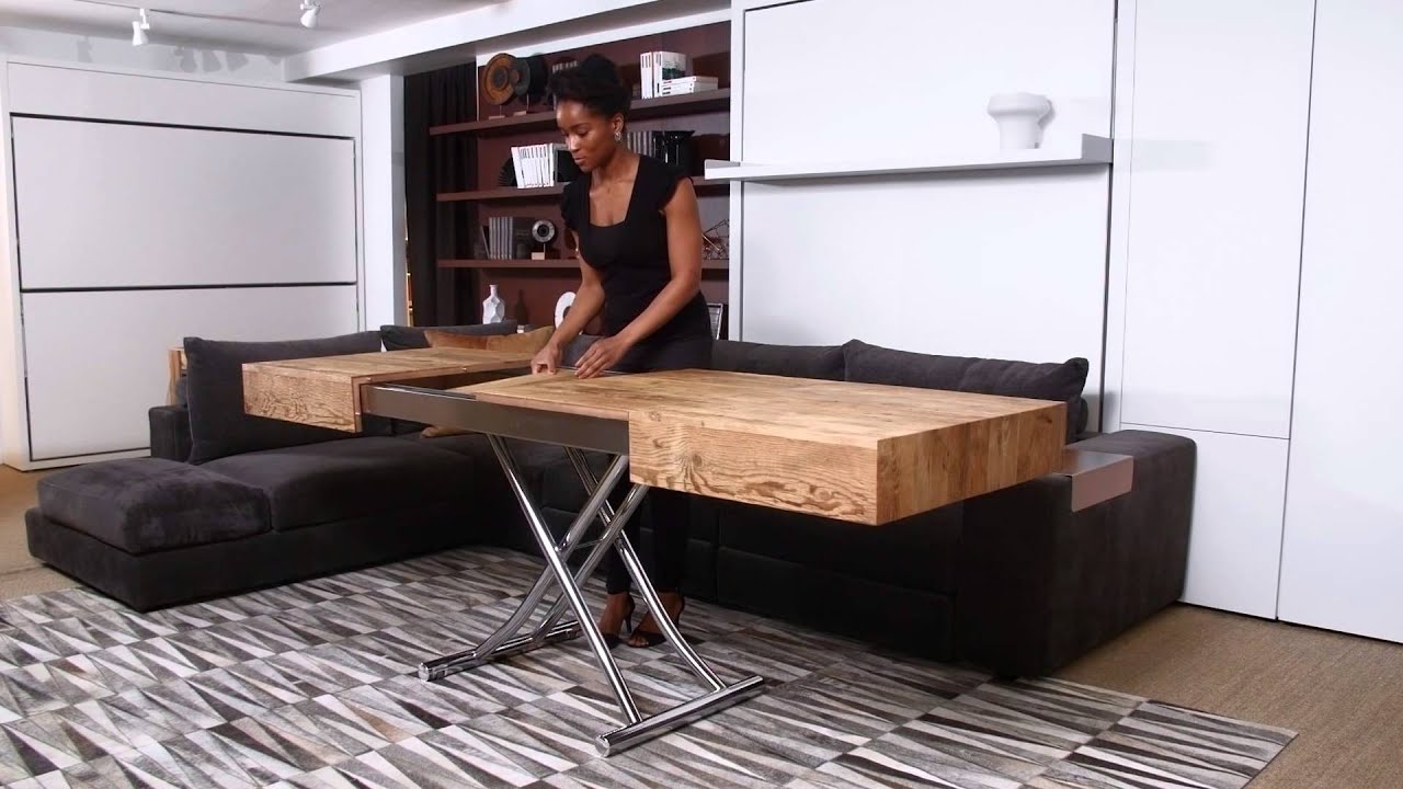 The Cristallo table is a transforming coffee table with a metal frame that extends to perform a number of functions. This space-saving piece is adjustable to various heights — from coffee table to dining table — and features two self-storing leaves. Available in glass, wood and new slate and reclaimed pine finishes.