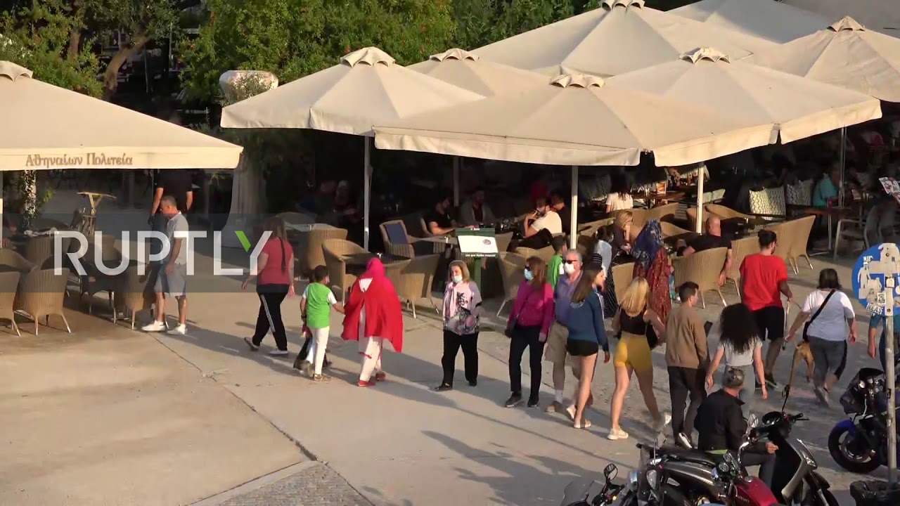 The Acropolis Hill, which hosts the UNESCO World Heritage Site and world-renowned Parthenon, could be seen crawling with visitors walking past the numerous terraces at the foot of it. The Acropolis itself reopened for visitors last week.