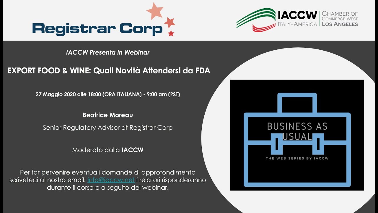 Terzo evento live della serie Business As Usual, IACCW presenta in webinar, con il Socio Camerale, ed esperto in materia di FDA, Registrar Corp.: Export Food & Wine, Quali Novità’ Attendersi da FDA.