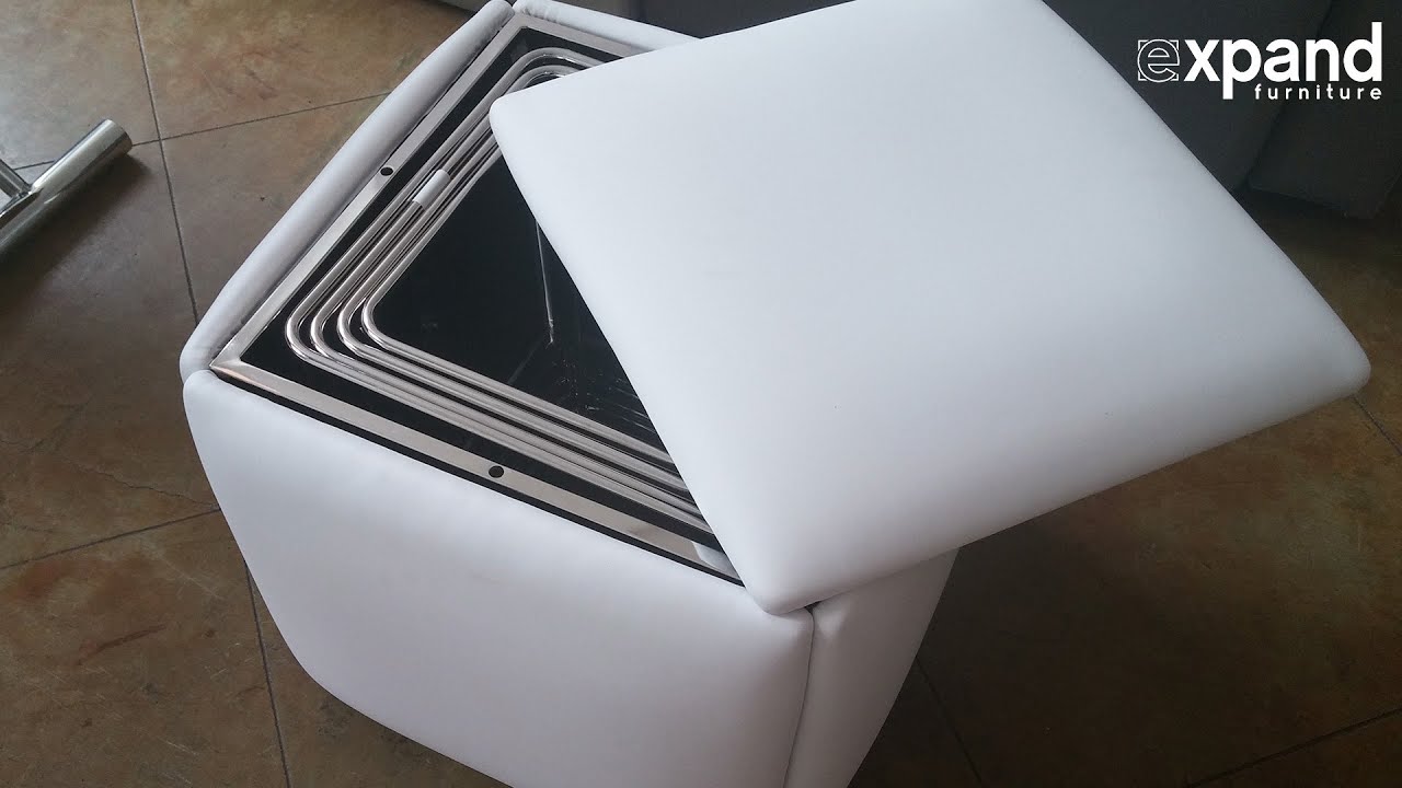 Italian Made Ottoman Transforms into 5 seats. A smart space saving furniture design for your living room or dining room. We show you a demonstration of how to build the 5 seats, a pairing with an extending dining table and how to compact this back into the single cube from 5 seats.