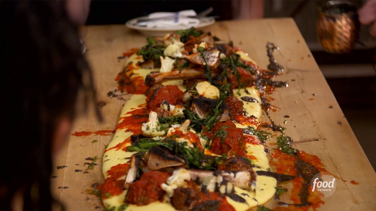 Creamy polenta is poured right 👏onto👏the👏TABLE 👏 and topped with meatballs and cheese at Fortina Pizza!