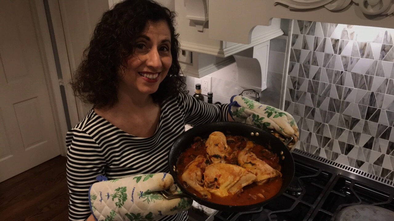 How to make Italian chicken in Marsala wine using only one pot or one large casserole/frying pan with high sides for the whole family! Method shown is for one cut-up, bone-in, skin-on chicken for four people. First, brown chicken inolive oil, skin down and turn. Remove from pan and add chopped onions, garlic, and pancetta. Soften and then add Marsala wine. Boil off half of the wine and then add chopped tomatoes and mushrooms. Put chicken back into the pot and cook until done!