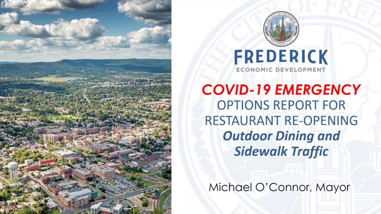 The City of Frederick anticipates that the State of Maryland and Frederick County may reopen restaurants for indoor and outdoor dining soon. Outdoor dining is expected to be highly popular for both patrons and owners. The City has evaluated several options for safely increasing outdoor dining and pedestrian accessibility. Public feedback is requested on the suggested options. Learn more at bit.ly/FrederickReopens