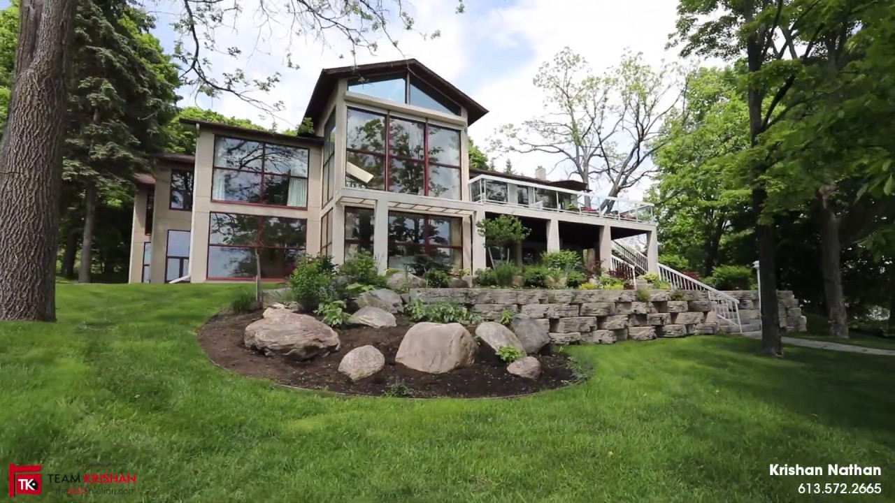 Contemporary architecture, opulent finishes, meticulously manicured landscaping and an outstanding 124ft of South facing waterfront merge together to create 4952 Bath Road. Architect Armando Sardinha the mastermind behind this magnificent construction, this jaw-dropping 5 bedroom 3.5 bath custom designed 5326 sq ft luxury waterfront home is one you will not want to miss. With conservation to the front of the property and Lake Ontario to the rear, take the lengthy driveway down and be prepared to get blown away. Step inside the main level through the foyer featuring glass blocks and inside entry to the double garage to be greeted by the massive atrium with soaring vaulted ceilings, skylights beaming with sunlight and ceramic from Spain beneath your feet. Take the stairs to the upper level to find breath-taking panoramic views of Lake Ontario via floor to ceiling windows in almost every room and wide plank hardwood sourced from British Columbia throughout. The upper level is host to a huge living area, a separate dining room, an open concept eat-in kitchen including tile backsplash, an oversized island with breakfast bar and built-in appliances, balcony access by the dining nook connected to the large family room possessing a wood burning fireplace with a marble base finish and doors to the enormous terrace overlooking Parrot’s Bay and Lake Ontario. You’ll also find another large carpeted bedroom, a 2pc bath and the master bedroom with walk-in closet and 6pc ensuite featuring marble from Italy, a separate jacuzzi tub, his & hers sink combination and water closet containing a toilet and bidet. The main floor features French doors to a large study with built-in shelfing and outdoor access, a recroom currently used as an exercise room with a walk-out to the interlocking brick patio, a 4pc bath with cheater access, a sauna, 3 spacious carpeted bedrooms, one with a walk-in closet, a kitchenette for in-law potential, another 3pc bath with cheater access, a main floor laundry room and an abundance of storage space. The backyard is lush with gardens, has custom elevated stone landscaping, and a staircase down to the water to the personal private dock with the opportunity for expansion for the resourceful visionary. 5 minutes to Amherstview, less than 15 minutes to Kingston and 10 minutes to the 401, everything you need is well within reach. The lap of luxury is waiting for you, so call to book your private showing today before the opportunity to call this palace-like home yours disappears.