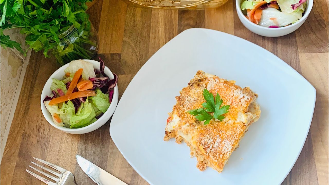 Espalhe um pouco de molho bechamel no fundo da tigela, arrume 3 folhas de lasanha e despeje a mistura de carne moída por cima. Repita o processo até que a tigela esteja cheia. Pré-aqueça o forno a 200 graus, depois abaixe p 180 graus e deixe assar por 40 minutos. Depois de pronto rale o queijo Parmesao por cima e deixe esfriar por 5 minutos. Desfrute dessa saborosa lasanha italiana caseira.