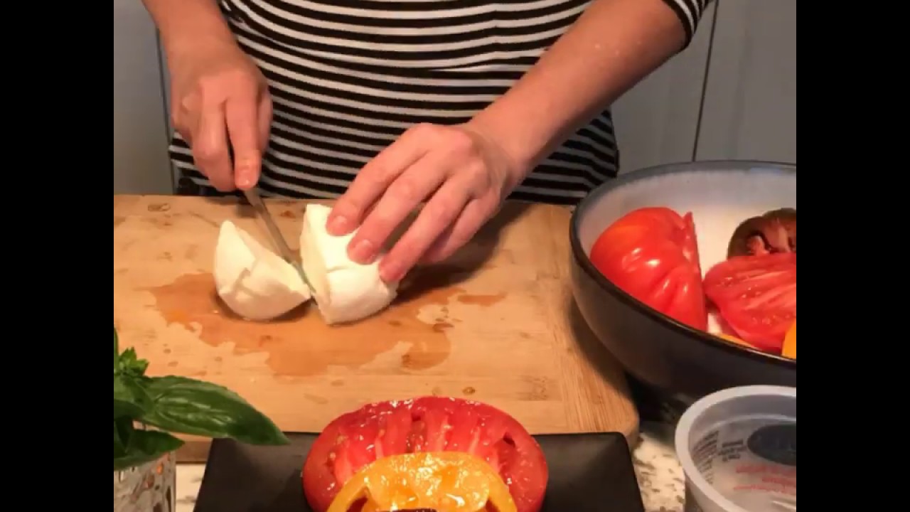 How to make Caprese Salad—a simple combination of fresh, colorful, ripe tomatoes, buffalo mozzarella (from the Italian water buffalo in the Campagna region of Italy) and fresh basil leaves. Courtesy of Stella Lucente, LLC for Conversational Italian for Travelers books, demonstrated by author and blogger Kathryn Occhipinti. For the recipe go to blog.learntravelitalian at: