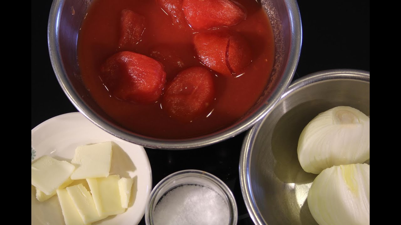 1. Combine the tomatoes, their juices, the butter and the onion halves in a saucepan. Add a pinch or so of salt.