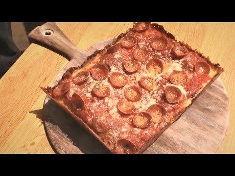 Classically baked in hefty pans made by auto manufacturers, the pizzas are rectangular and feature thick crusts, lots of cheese and a chunky tomato sauce.