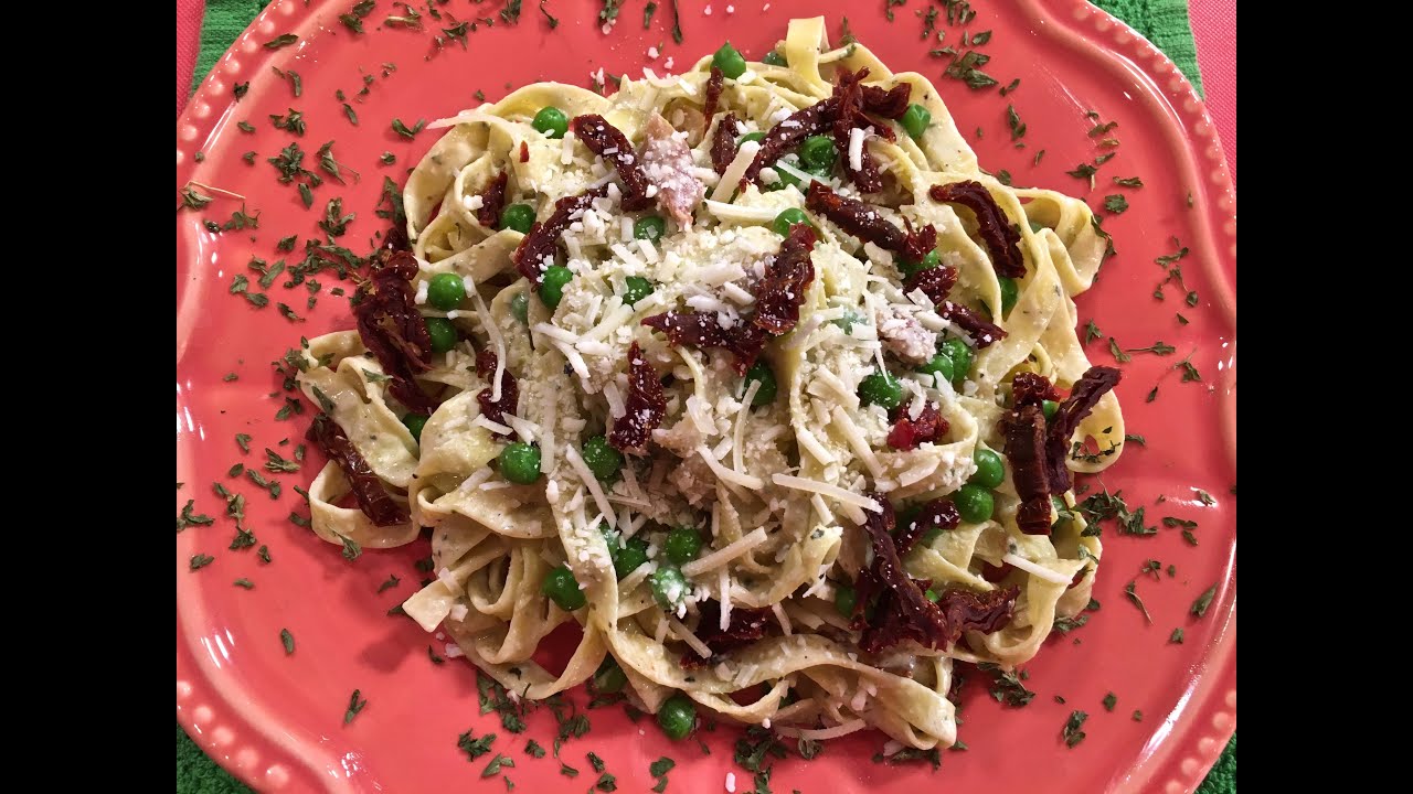8oz Fettuccine – Red Sundried Tomatoes – Petite Peas – Pancetta (Italian Bacon) – Garlic & Basil – Nutmeg