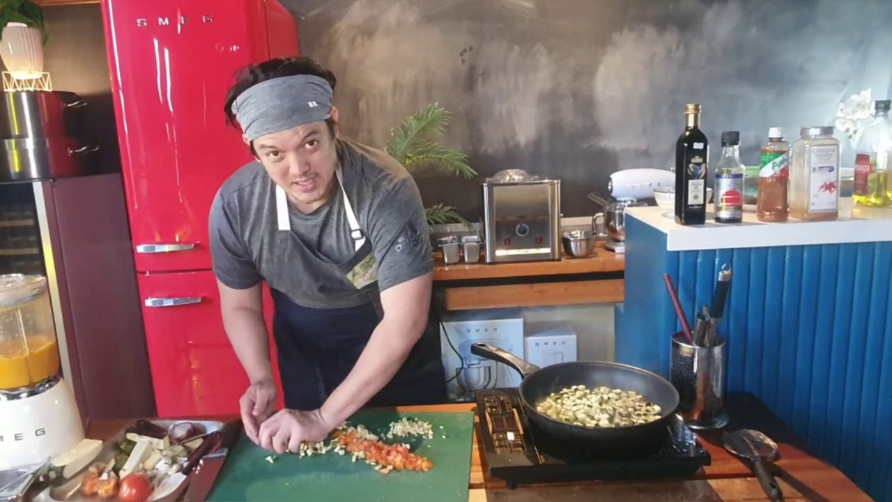 make caponata with zucchini, eggplant, cashew, ginger, garlic, onion, balsamic, tamari and olive oil