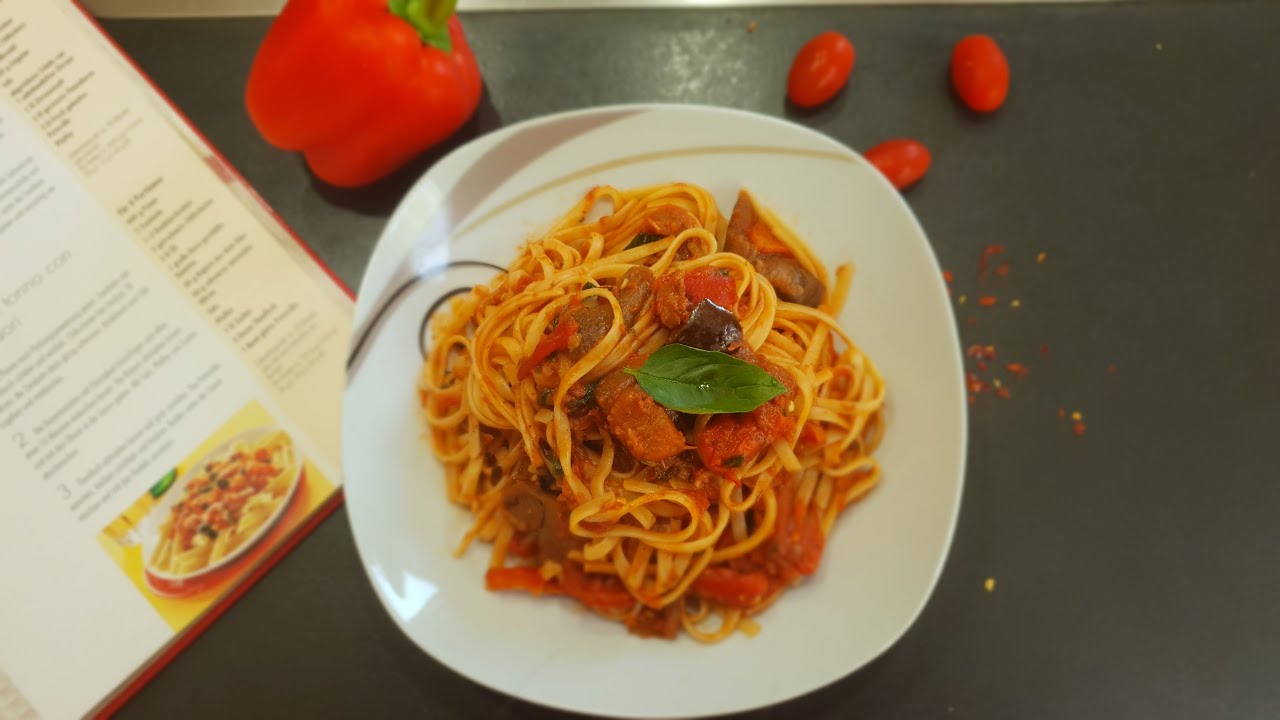 Linguine in tomato sauce with roasted eggplant and red bell pepper.