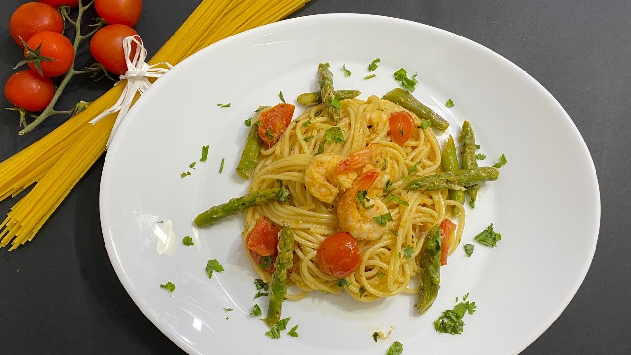 Hello my friends , today i share with you spaghetti . spaghetti one of the world famous food. specially Italian style spaghetti , different part of Italy cook spaghetti different different way . today i show you spaghetti with shrimp , asparagus and tomato . its really very yummy and delicious .hope so people try at your home ……………..and let me know !below i give you ingredients:-