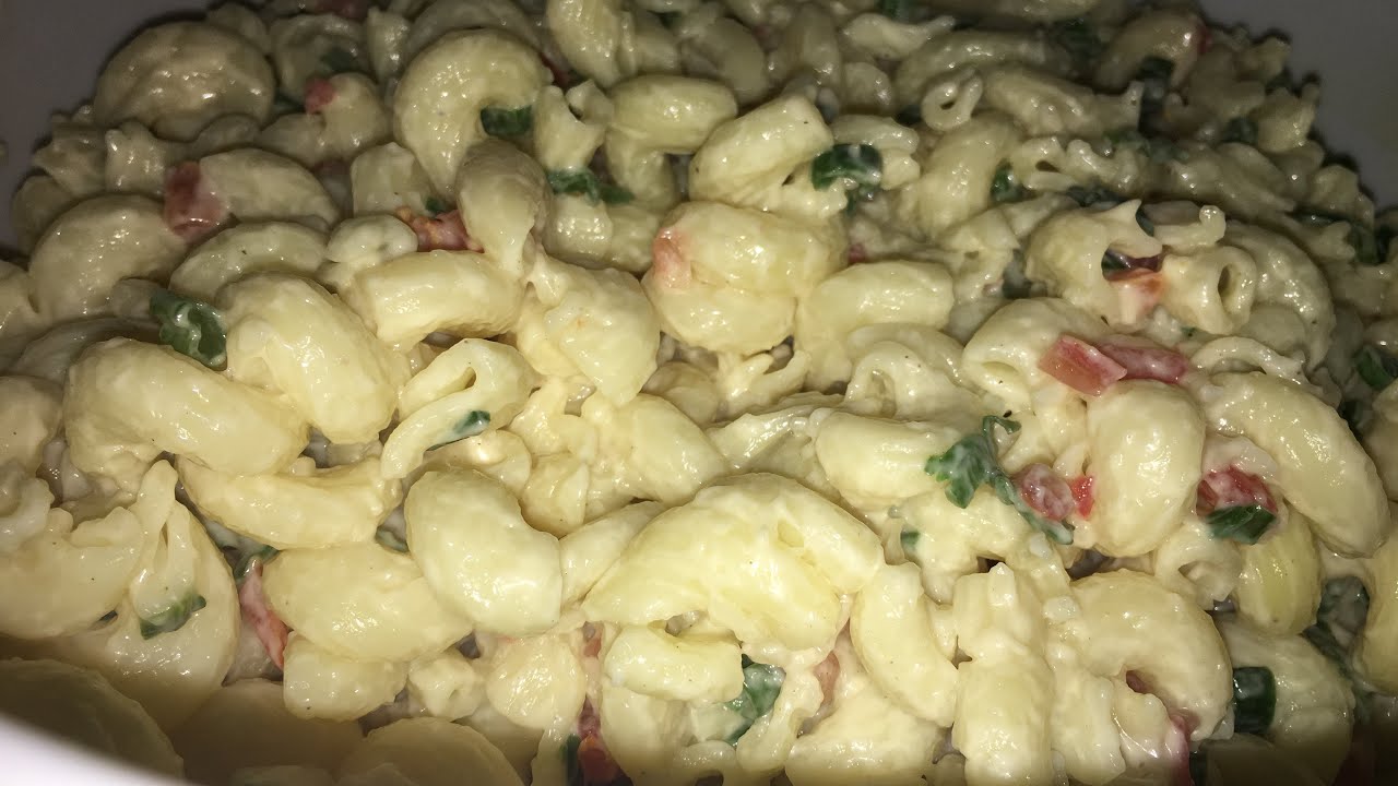 Scoop up a bowl and combine 1 cup mayonnaise, 1 tsp salt, 1/2 tsp white pepper and 1 tbsp mustard in it; mix them well. After that, make a way for 1 pack(400gm) boiled pasta, 1/2 cup chopped tomatoes(seedless) and 1 cup chopped spring onions(green part only) into the mixture and toss every ingredient well. For the dressing part, garnish with chopped tomatoes and chopped spring onions(green part only) if you like.