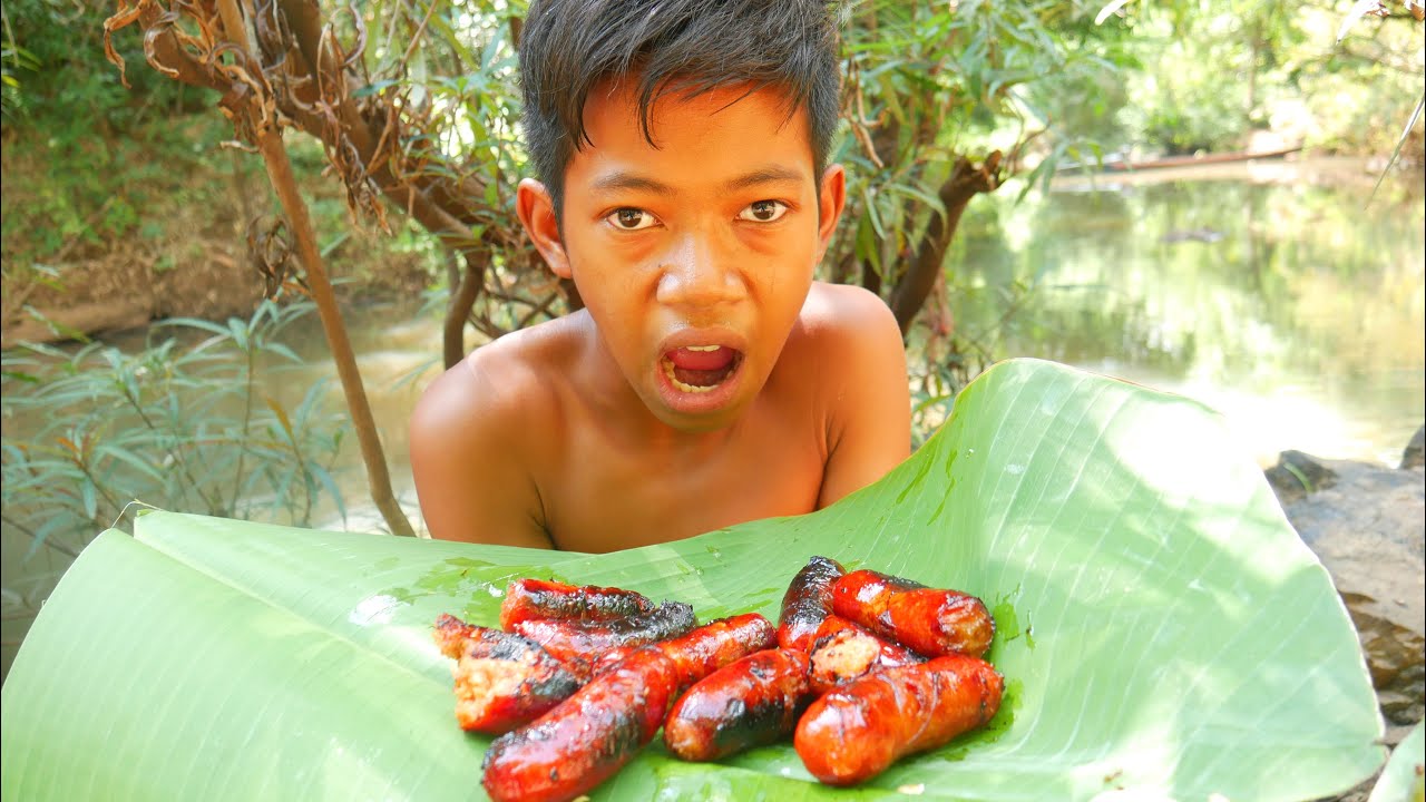 Primitive Technology – Eating delicious – Cooking sausages on a rock Primitive Technology – Eat Skill