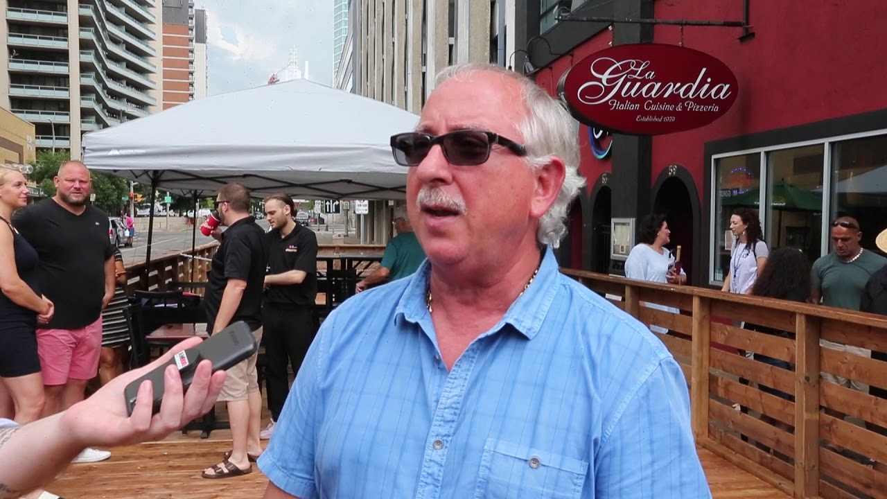 Three local restaurants are setting up outdoor eatery on Pitt St. E. in downtown Windsor, ON. A press conference was held on Friday, July 10, 2020, to unveil the collaborative effort. Michael Ciliberto, owner of La Guardia Italian Cuisine speaks to reporters during the event.