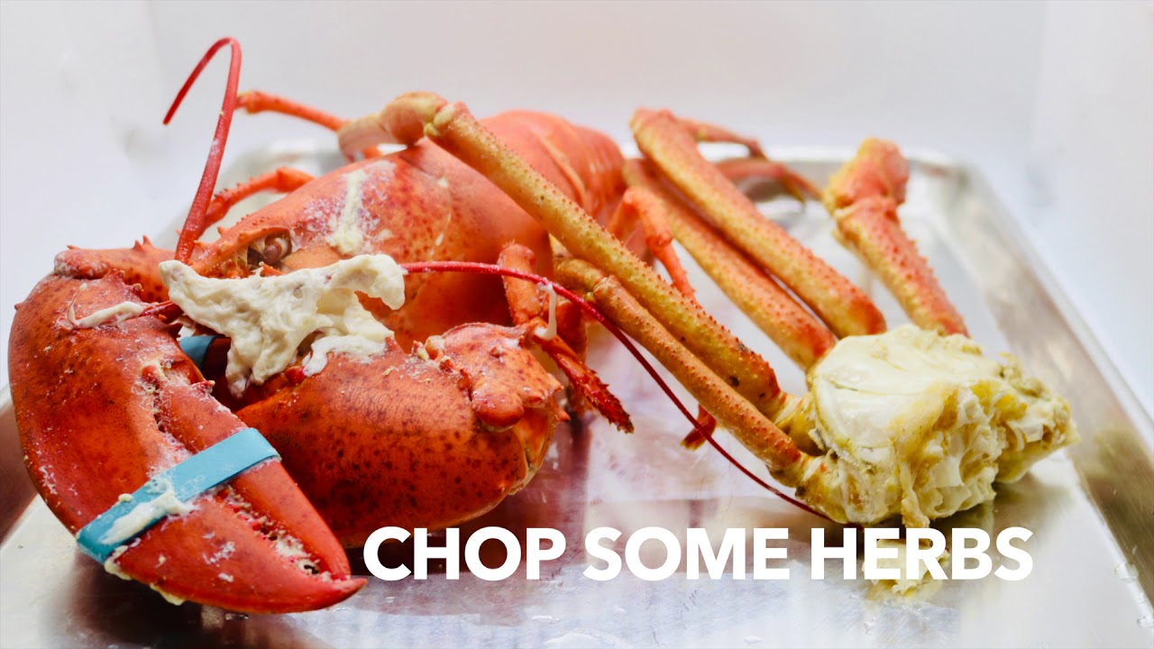 1. In a large steaming pot bring water to a boil with salt and ½ of squeezed lemon. With a large knife stick back of lobster to kill then drop in pot to steam. This is a humane way of killing the lobster rather than steaming alive. After about 10 minutes drop in frozen crab cluster to cook though. Once crab and lobster are cooked set and let cool before cracking. Set aside to add to pasta later on.