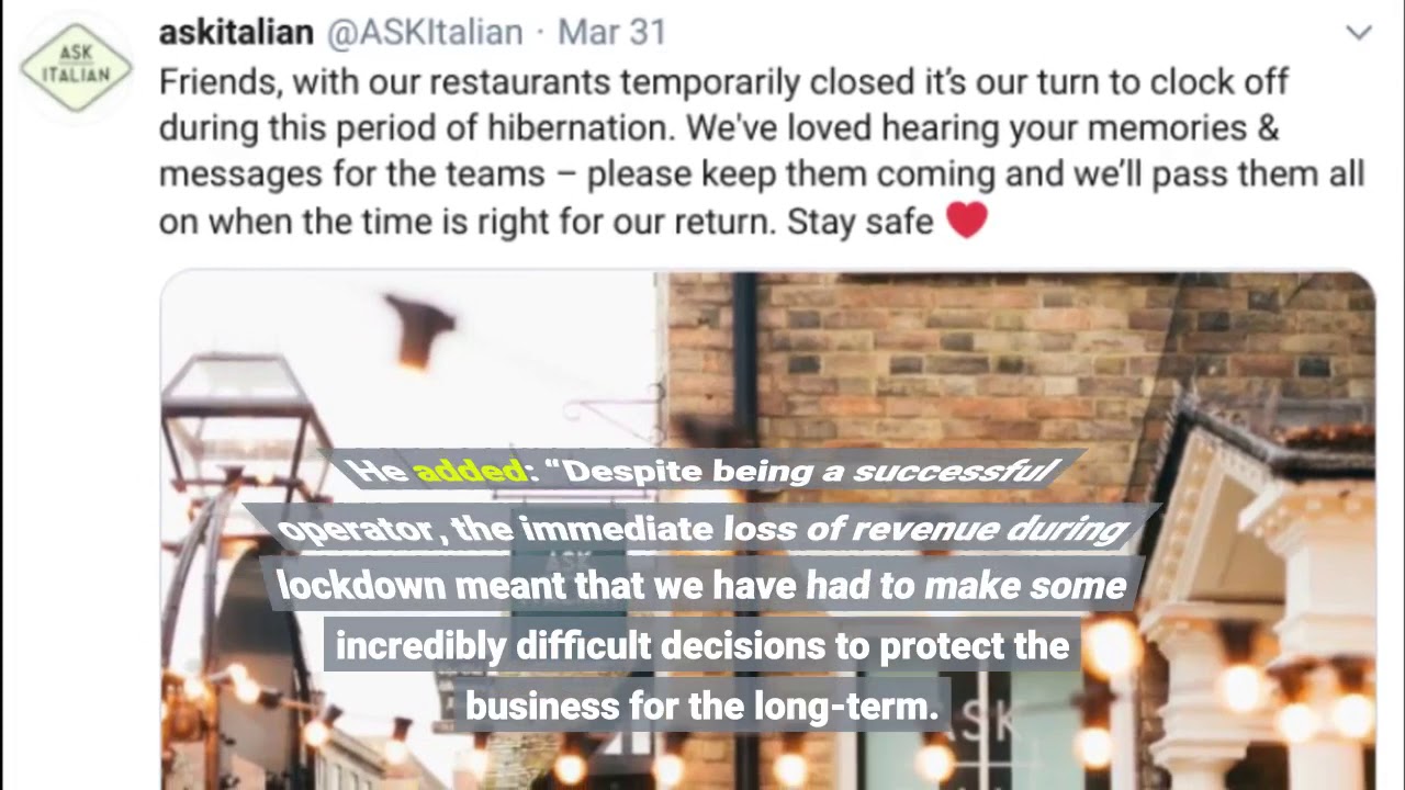 Zizzi and Ask Italian are set to permanently close 75 of their restaurants, putting up to 1,200 jobs at risk. Azzurri Group, the owner of the two chains, has been pulled from administration by US investment firm TowerBrook Capital Partners after the coronavirus crisis rocked the industry. As part of the deal, 225 restaurants and shops have been saved along with 5,000 jobs – but 75 will not reopen. Steven Holmes, the chief executive of Azzurri Group, said the “profound impact” of the UK lockdown on the casual dining sector had brought the company “to a standstill”. He added: “Despite being a successful operator, the immediate loss of revenue during lockdown meant that we have had to make some incredibly difficult decisions to protect the business for the long-term. “It is with deep sadness that this process will result in the permanent closure of a number of sites and that we must say goodbye to greatly valued employees across our brands.” The cuts on Friday mark the latest casualty for British business as COVID-19 restrictions begin to ease. Among the hospitality brands making cuts are the Casual Dining Group, which owns Bella Italia, Cafe Rouge and Las Iguanas; Carluccio’s, Pret a Manger and Le Pain Quotidien. Pizza Express is also expected to announce the closure of around 75 restaurants.