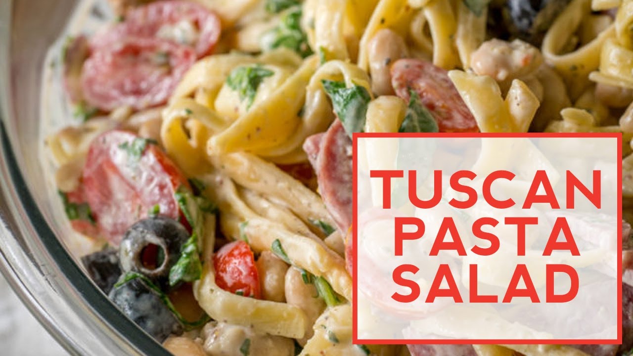 Skip the macaroni or penne or rotini pasta, and instead go with fettuccine or longer egg noodles of some sort. The noodles grip the Italian dressing, so you get tons of flavor in each bite, along with chunky bites of salami, cannellini beans, olives, tomatoes, spinach, red onions and fresh herbs. Plus, the dressing is deliciously creamy, while still feeling light (perfection!); it’s got mayo and Greek yogurt, and then it gets its kick from white wine vinegar and dijon mustard – with a healthy dose of Italian seasoning to make this as Tuscan as it can get. It’s jam-packed with flavor (and nutrients!) and we wouldn’t have it any other way.