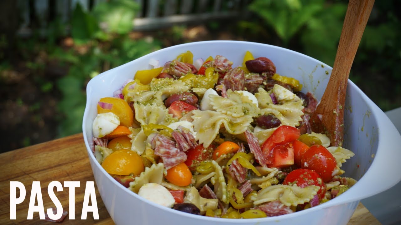 Combine pesto, EVOO & red wine vinegar. Chop all veggies.