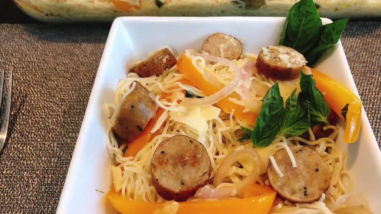 A light, but hearty pasta dish made with angel hair pasta, Italian chicken sausage, onions, peppers, white wine, and fresh basil. Simple, healthy, and delicious. Less than 30 minutes.