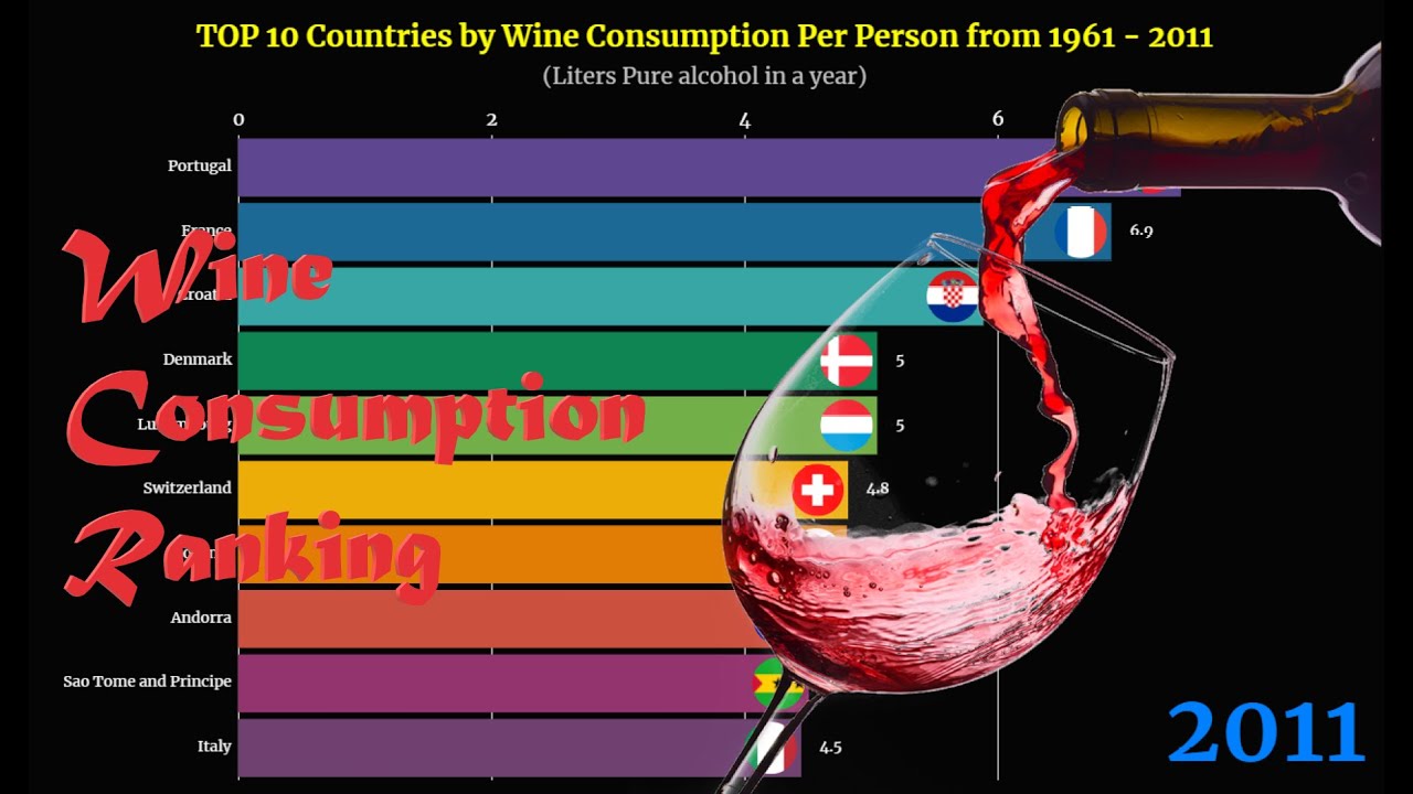 🎬This bar chart race shows the Top 10 country ranking trend by their Wine Consumption per person from 1961 to 2011.