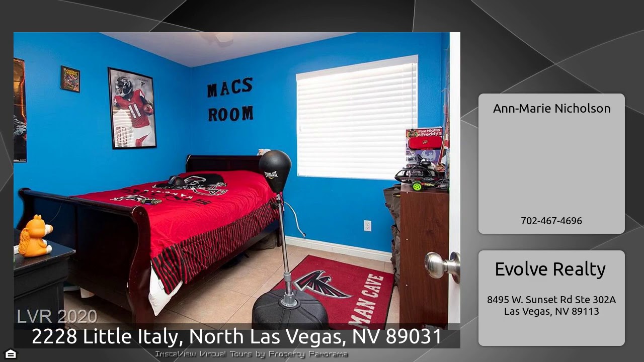 The Virtual Tour for the property at 2228 Little Italy, North Las Vegas, NV 89031 listed for $257,000: Other homes for sale by Ann-Marie Nicholson of Evolve Realty: Beautiful single family home that displays true Pride of Ownership! Home situated on a corner lot and features an open floor plan. Kitchen has upgraded granite counter tops, fresh paint, newer faucet and sink, and stainless steel appliances. Laminate wood floors throughout (living room, kitchen, hallway, and dining room). Tile flooring in bedrooms. Backyard is perfect for entertaining and features an above ground pool and covered …