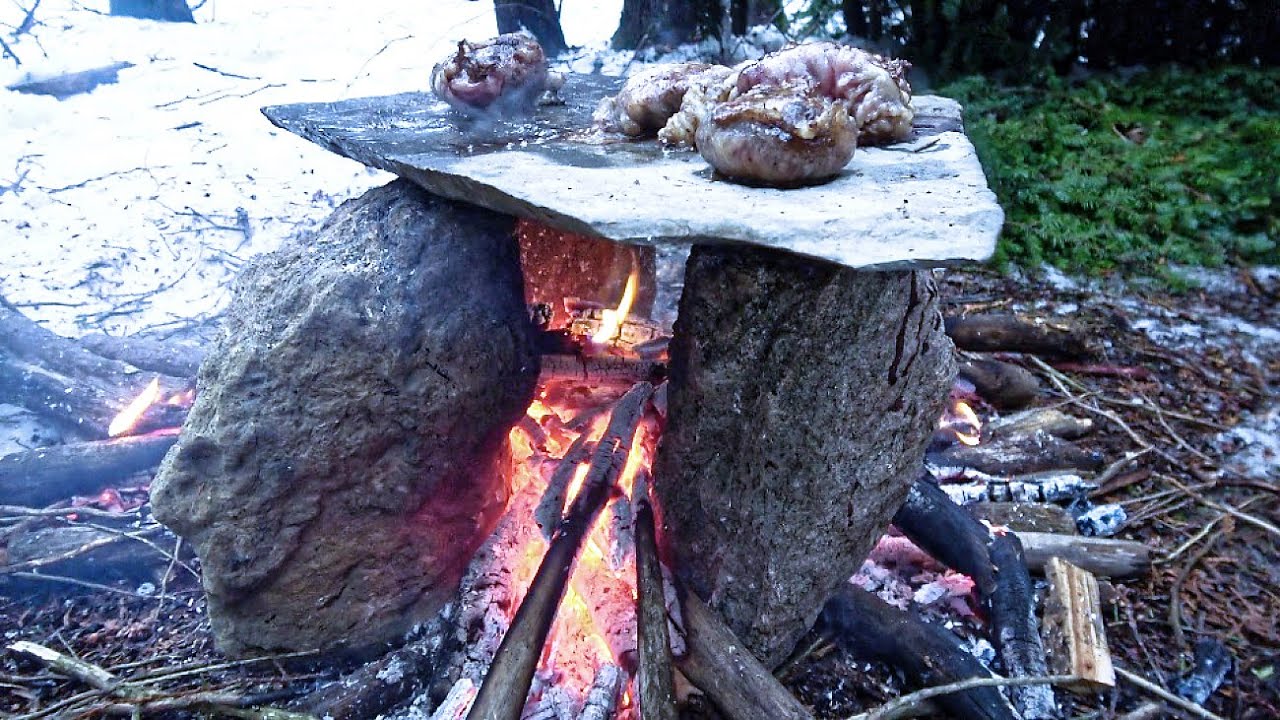 I’ll demonstrate how to cook a meat buffet using just a rock and the materials around me from start to finish including friction fire!