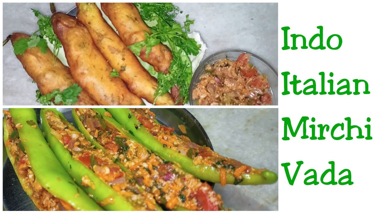 Mirchi vada is a popular street snack of Rajasthan.Here I present fusion mirchi vada with a twist in masala stuff.Green peppers are stuffed with healthy Italian style masala, wrapped with besan(chickpeas flour) and then deep fried.Served with tasty tangy chutney.Enjoy Indo-Italian Mirchi Vada this rainy season.Vegetarian dish easy to make at home.