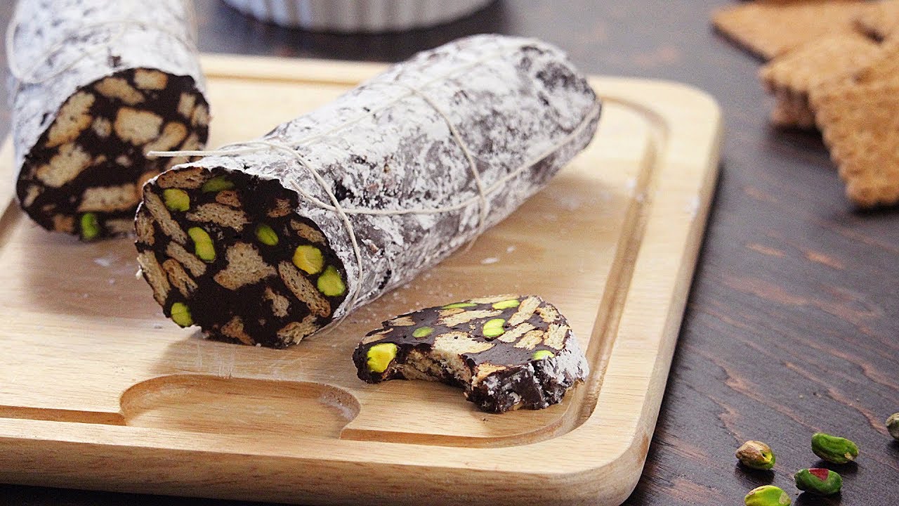 Cover completely the chocolate salame with the parchment paper and then firmly roll it, as if it were a rolling pin, to create a smooth, rounded cylinder. Twist the ends by grasping both ends of the parchment paper.