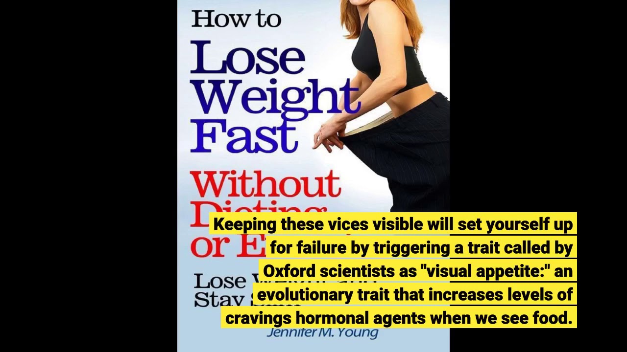 Christopher Gower/Unsplash Ever heard of the seafood diet plan? You see food and instantly consume it! To curb your junk food usage, start by ridding your work area and kitchen counters of your dietary kryptonite. Keeping these vices visible will set yourself up for failure by triggering a trait called by Oxford scientists as “visual appetite:” an evolutionary trait that increases levels of cravings hormonal agents when we see food.