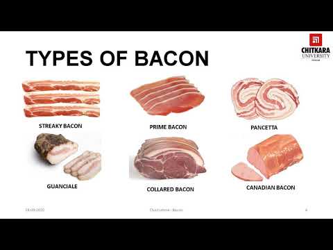 Bacon is a type of cured pork made from various cuts, typically from the pork belly or from the less fatty back cuts. It is eaten on its own, as a side dish, or used as a minor ingredient to flavour dishes. Bacon is also used for barding and larding roasts, especially game, including venison and pheasant.
